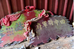 簡陋神壇後來缺乏管理,牌匾(上有丙子年註記,即1997年)委棄於地(2018年10月攝)