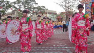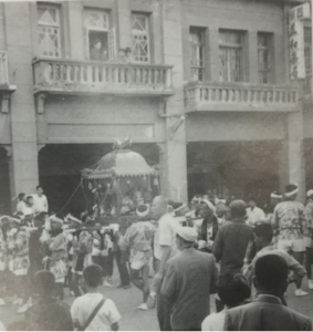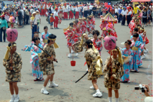 1959年慶祝媽祖誕辰一千年,彰化鹿港廟會尚可見小學生著日本式服裝扛神輿的陣頭。113